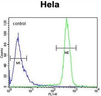 - C1orf110 Antibody (C-term) (Cat. #AP50527PU-N) flow cytometric analysis of Hela cells (right histogram) compared to a negative control cell (left histogram).FITC-conjugated goat-anti-rabbit secondary antibodies were used for the analysis.