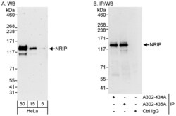 - Detection of human NRIP by western blot and immunoprecipitation. Samples: Whole cell lysate (5, 15 and 50 µg for WB; 1 mg for IP, 20% of IP loaded) from HeLa cells. Antibodies: Affinity purified rabbit anti-NRIP antibody A302-435A used for WB at 0.04 µg/ml (A) and 1 µg/ml (B) and used for IP at 10 µg/mg lysate. NRIP was also immunoprecipitated by rabbit anti-NRIP antibody A302-434A, which recognizes an upstream epitope. Detection: Chemiluminescence with exposure times of 3 minutes (A) and 10 seconds (B).
