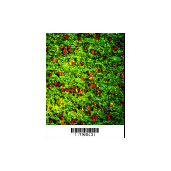 - Immunofluorescence analysis of DPT Antibody (Center) with paraffin-embedded human brain tissue . 0.05 mg/ml primary antibody was followed by FITC-conjugated goat anti-rabbit lgG (whole molecule). FITC emits green fluorescence.Red counterstaining is PI.