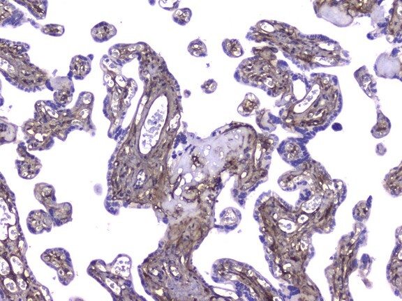 - IHC analysis of Collagen IV using anti-Collagen IV antibody. Collagen IV was detected in paraffin-embedded section of human placenta tissue. Heat mediated antigen retrieval was performed in citrate buffer (pH6, epitope retrieval solution) for 20 mins. The tissue section was blocked with 10% goat serum. The tissue section was then incubated with 2µg/ml mouse anti-Collagen IV Antibody overnight at 4°C. Biotinylated goat anti-mouse IgG was used as secondary antibody and incubated for 30 minutes at 37°C. The tissue section was developed using Strepavidin-Biotin-Complex (SABC) with DAB as the chromogen.