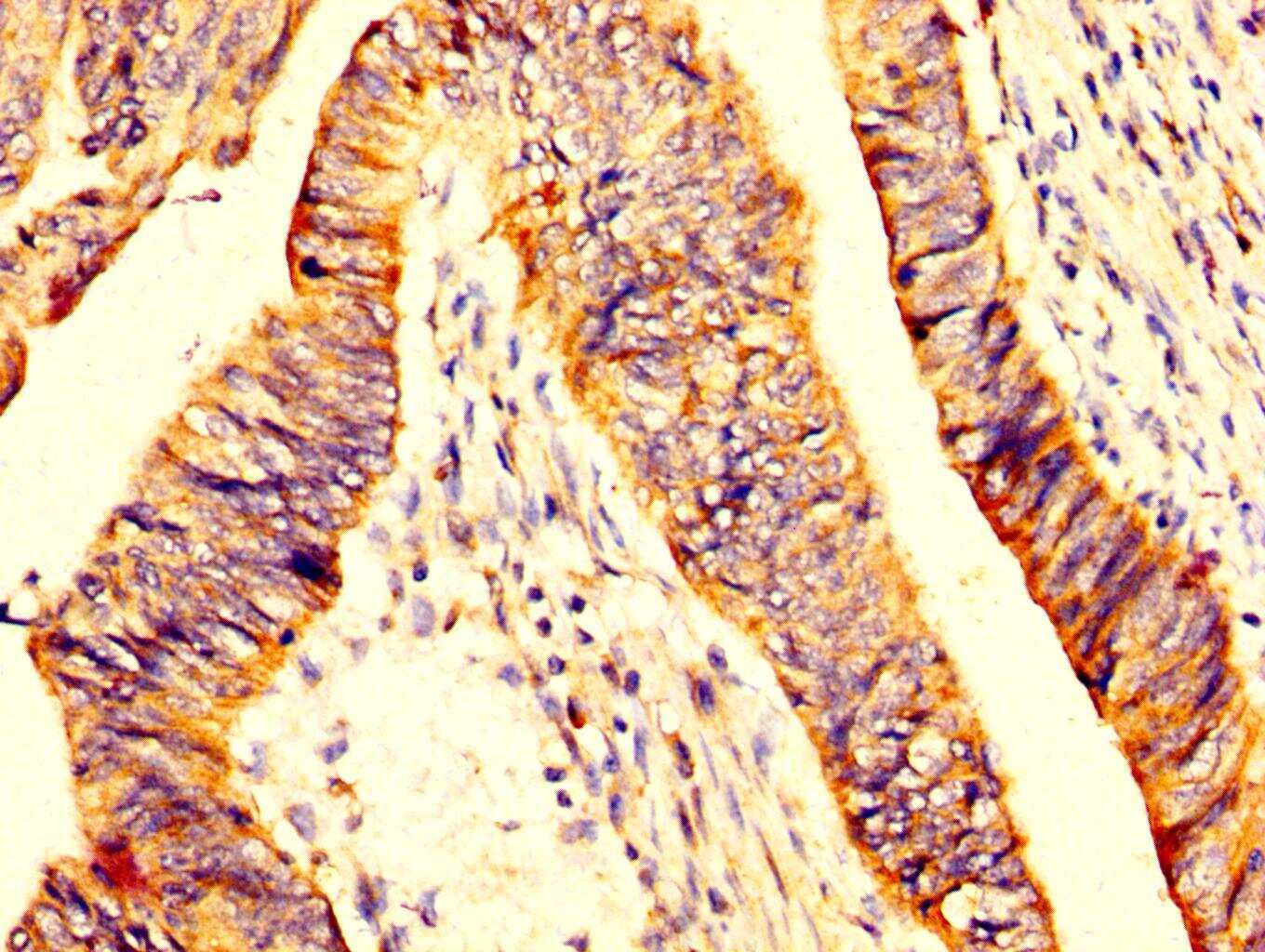 - Immunohistochemical analysis of MYOC in paraffin embedded human colon cancer using a MYOC polyclonal antibody (Product # PA5-98815) at a dilution of 1:200. After dewaxing and hydration, antigen retrieval was mediated by high pressure in a citrate buffer (pH 6.0). Section was blocked with 10% normal goat serum 30min at RT. Then primary antibody (1% BSA) was incubated at 4°C overnight. The primary is detected by a biotinylated secondary antibody and visualized using an HRP conjugated SP system.