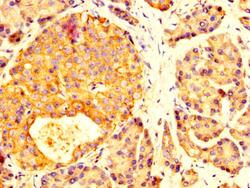 - Immunohistochemical analysis of MYOC in paraffin embedded human pancreatic tissue using a MYOC polyclonal antibody (Product # PA5-98815) at a dilution of 1:200. After dewaxing and hydration, antigen retrieval was mediated by high pressure in a citrate buffer (pH 6.0). Section was blocked with 10% normal goat serum 30min at RT. Then primary antibody (1% BSA) was incubated at 4°C overnight. The primary is detected by a biotinylated secondary antibody and visualized using an HRP conjugated SP system.