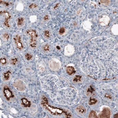 - Immunohistochemistry-Paraffin: ACE-2 Antibody (CL4035) [NBP2-59037] - Staining of human kidney shows strong positivity in apical membrane in cells in proximal tubules.