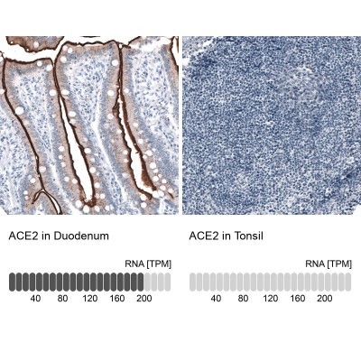 - Immunohistochemistry-Paraffin: ACE-2 Antibody (CL4035) [NBP2-59037] - Staining in human duodenum and tonsil tissues using NBP2-59037 antibody. Corresponding ACE2 RNA-seq data are presented for the same tissues.
