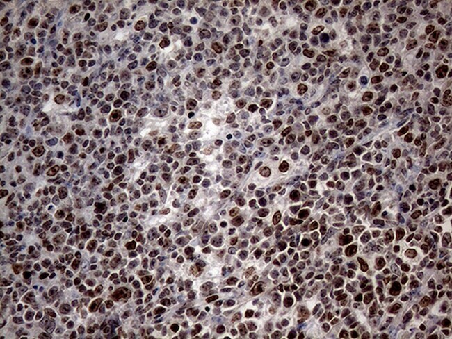 - Immunohistochemical staining of paraffin-embedded human lymph node tissue within the normal limits using anti-SP110 mouse monoclonal antibody. (Heat-induced epitope retrieval by 1mM EDTA in 10mM Tris buffer (pH8.5) at 120°C for 3 min, TA807939)(1:150).