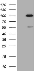 - HEK293T cells were transfected with the pCMV6-ENTRY control (Left lane) or pCMV6-ENTRY SP110 (RC205648, Right lane) cDNA for 48 hrs and lysed. Equivalent amounts of cell lysates (5 µg per lane) were separated by SDS-PAGE and immunoblotted with anti-SP110. Positive lysates LY417943 (100 µg) and LC417943 (20 µg) can be purchased separately from OriGene.