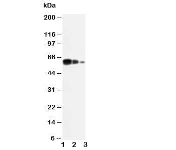 - Western blot testing of ADAM10 antibody and Lane 1: recombinant human protein 10ng; 2: 5ng; 3: 2.5ng