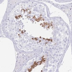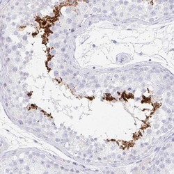 - Immunohistochemistry-Paraffin: C2orf57 Antibody [NBP2-14406] - Staining of human testis shows distinct positivity in a subset of cells in seminiferus ducts.