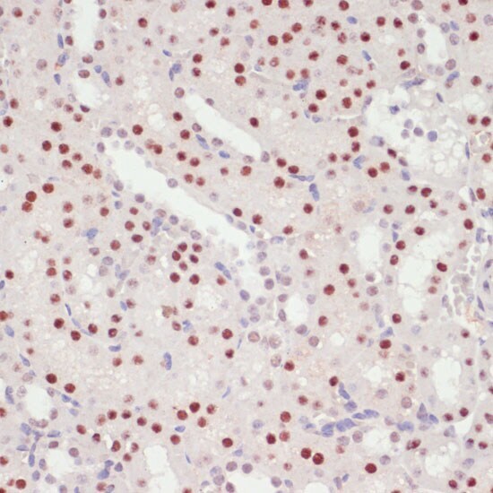 - Immunohistochemistry analysis of SNRNP70 in paraffin-embedded mouse kidney. Samples were incubated with SNRNP70 Polyclonal antibody (Product # PA5-110406) using a dilution of 1:100 (40x lens). Perform microwave antigen retrieval with 10 mM PBS buffer pH 7.2 before commencing with IHC staining protocol.