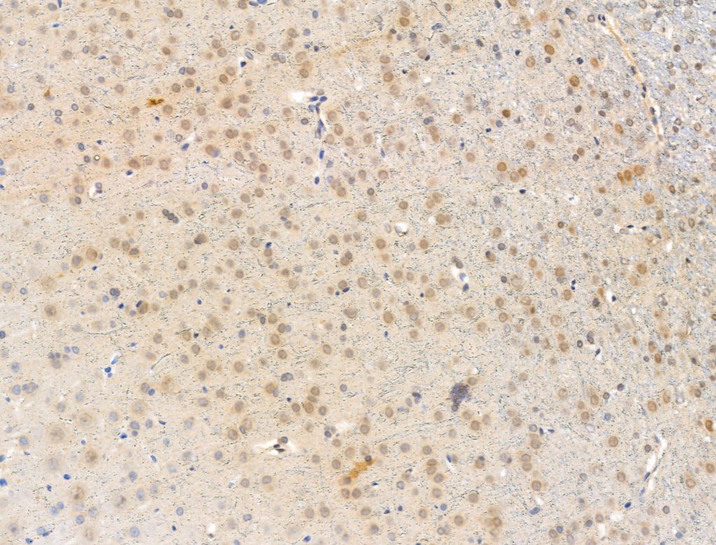 - Immunohistochemistry analysis of SNRNP70 in rat brain tissue. Samples were treated with formaldehyde and treated with citrate buffer for antigen retrieval, blocked, and incubated (1.5 hours at 22°C) with polyclonal antibody (Product # PA5-115943) at a dilution of 1:100. Secondary staining was applied with HRP conjugated anti-Rabbit.