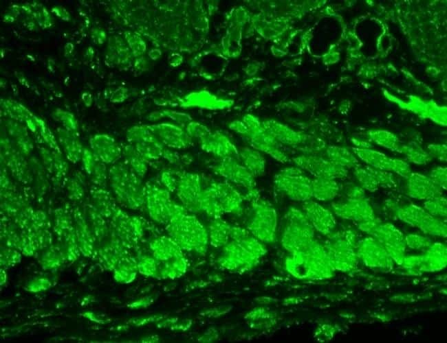 - Immunohistochemistry analysis of KCNT2 in paraffin-embedded mouse back skin. Sample was fixed with Bouin's fixative solution, incubated with KCNT2 monoclonal antibody (Product # MA5-27590) using a dilution of 1:100 (1 hour at RT), and followed by FITC Goat Anti-Mouse (green) (1 hour at RT) at a dilution of 1:50.