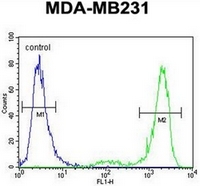 - Flow cytometric analysis of MDA-MB231 cells using KCNT2 / SLICK Antibody (C-term) Cat.-No AP52320PU-N (right histogram) compared to a negative control cell (left histogram). FITC-conjugated goat-anti-rabbit secondary antibodies were used for the analysis.