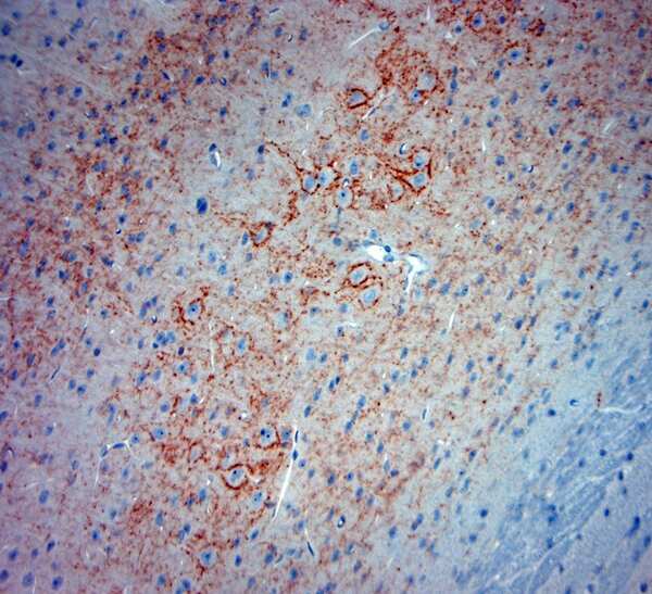 - Immunohistochemistry (Paraffin) analysis was performed in sections of mouse brain using Synaptotagmin 2 Polyclonal Antibody (Product #OSS00023W). The animal was perfused using Autoperfuser at a pressure of 130 mmHg with 300 ml 4% FA before being processed for paraffin embedding. HIER: Tris-EDTA, pH 9 for 20 min using Thermo PT Module. Blocking: 0.2% LFDM in TBST filtered thru 0.2 µm. Primary antibody: dilution 1:2000, incubated 30 min at RT using Autostainer. Sections were counterstained with Harris Hematoxylin.