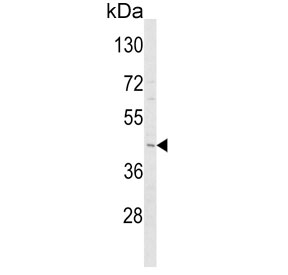 - Western blot testing of human Y79 cell lysate with Adiponectin receptor 1 antibody. Predicted molecular weight ~43 kDa.