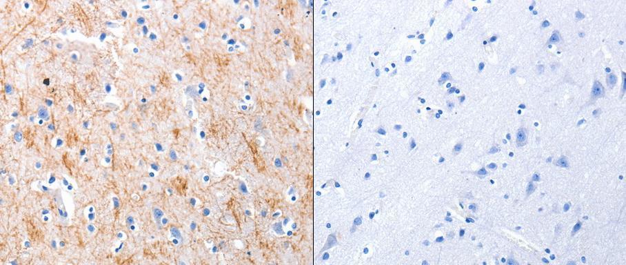 - Predicted cell location: Cytoplasm. Positive control: Human brain tissue. Recommended dilution: 1/5-20 The image on the left is immunohistochemistry of paraffin-embedded Human brain tissue using KISS1 antibody at dilution 1/5, on the right is treated with the synthetic peptide. (Original magnification: x200)