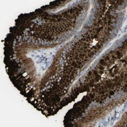 - Immunohistochemical staining of human stomach shows strong cytoplasmic positivity in glandular cells.