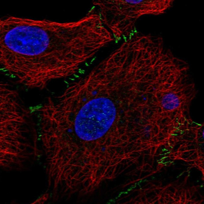- Immunofluorescent staining of human cell line A549 shows localization to cell junctions.