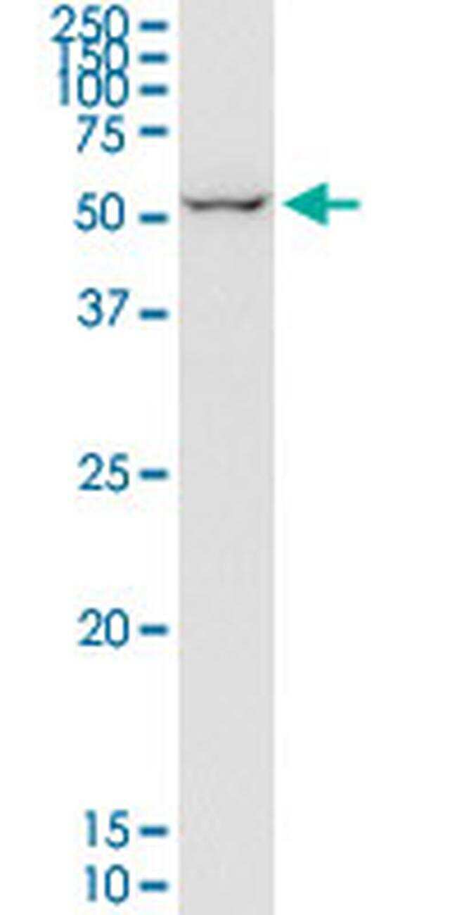 - Western Blot analysis of EIF2D expressed in transfected 293T cell line by anti-EIF2D monoclonal antibody (Product # MA5-18796), clone 2D10. Lane 1: EIF2D transfected lysate (Predicted MW: 64.7 KDa). Lane 2: Non-transfected lysate.