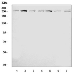 - Western blot testing of 1) human HeLa, 2) human HepG2, 3) human 293T, 4) human Jurkat, 5) rat brain, 6) mouse brain and 7) mouse lung lysate with TAF1 antibody. Expected molecular weight ~250 kDa.