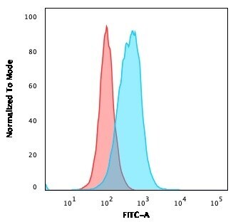 - Flow Cytometry analysis of PFA-fixed Ramos cells using Thymidylate Synthase Monoclonal Antibody (Product # 7298-MSM4-P1) followed by goat anti-Mouse IgG-CF488 (Blue); Isotype Control (Red).
