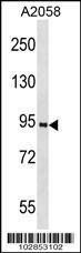 - PROX1 Antibody (K507) (Cat. #AP2035b) western blot analysis in A2058 cell line lysates (35ug/lane).This demonstrates the PROX1 antibody detected the PROX1 protein (arrow).