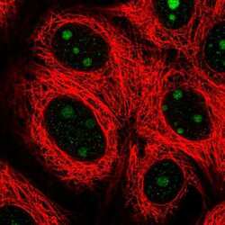 - Immunofluorecent analysis of SPATA17 in human cell line MCF7 using SPATA17 Polyclonal Antibody (Product # PA5-56341). Staining shows localization to nucleoli.