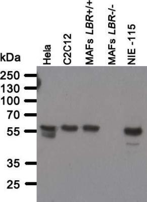 - Western Blot: Lamin B Receptor Antibody (BB2SS3F3) [NBP2-59947] - Analysis of whole cell lysate from human (Hela) and mouse (C2C12, immortalized mouse adult fibroblasts (MAFs), NIE-115) cell lines were separated on SDS-PAGE gel, transferred to nitrocellulose membrane and blotted with BB2SS3F3 antibody. Both primary and secondary antibodies were diluted in blocking buffer (5% nonfat dry milk resuspended in 0.1% Tween and 1X PBS). The predicted molecular weight is 70.7kDA and 71.4kDa for human and mouse LBR respectively. The absence of a band in LBR null MAFs indicated that the antibody specifically recognizes LBR.