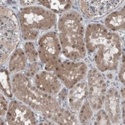 - Immunohistochemical staining of human kidney with C1orf100 polyclonal antibody (Cat # PAB22524) shows moderate nuclear and cytoplasmic positivity in tubular cells at 1:200-1:500 dilution.