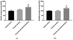 - Figure 3 Changes in the expression of NMDA receptor subunits (GluN1, GluN2A and GluN2B) in the nucleus accumbens in rats following cocaine self-administration. All data are expressed as % of control (mean +- SEM). N = 6 rats/group. * p < 0.05 vs. yoked saline. ( a ), GluN1 protein levels [% of control]; ( b ), GluN2A protein levels [% of control]. ; ( c ), GluN2B protein levels [% of control].
