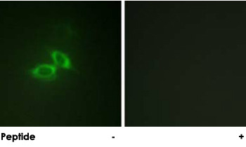 - Immunofluorescence analysis of NIH/3T3 cells, using GRIN1 polyclonal antibody (Cat # PAB18250).Peptide "+" means "peptide blocking".