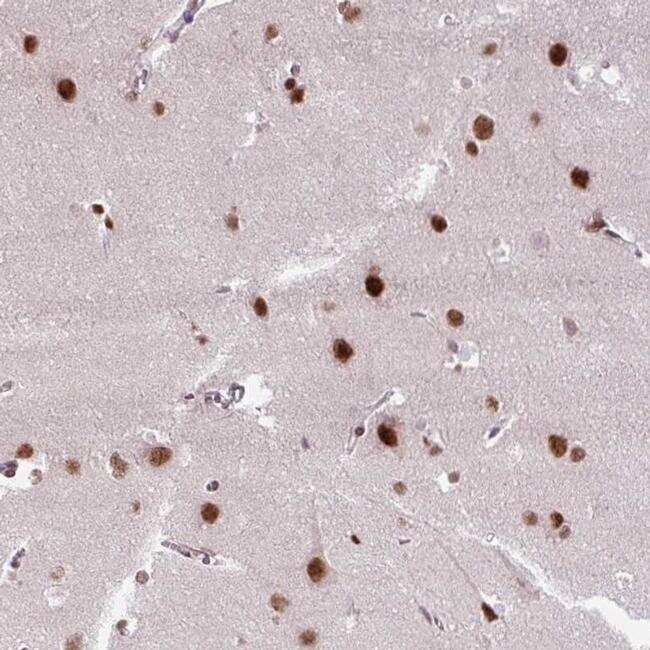 - Immunohistochemical analysis of Znf672 in human cerebral cortex using Znf672 Polyclonal Antibody (Product # PA5-63177) shows strong nuclear positivity in neuronal cells.