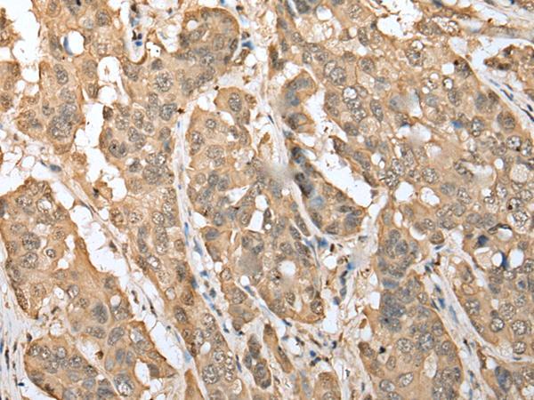 - Immunohistochemistry of paraffin-embedded Human breast cancer tissue using ZNF672 Polyclonal Antibody at dilution of 1:30(×200)