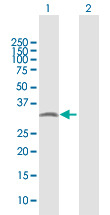- Western Blot analysis of PYCR2 expression in transfected 293T cell line (H00029920-T02) by PYCR2 MaxPab polyclonal antibody.Lane 1: PYCR2 transfected lysate(33.60 KDa).Lane 2: Non-transfected lysate.