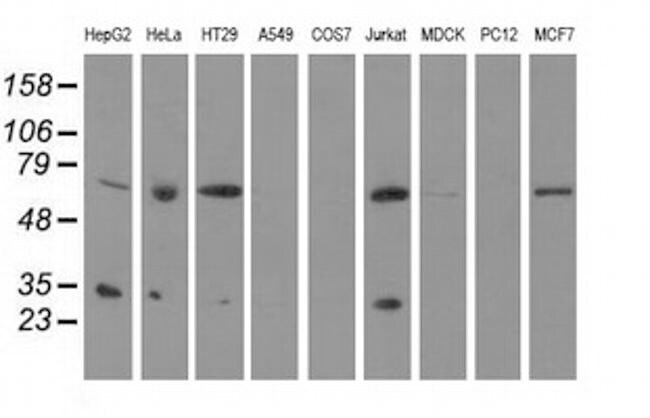 - Western blot analysis of extracts (35 µg) from 9 different cell lines by using anti-PYCR2 monoclonal antibody.