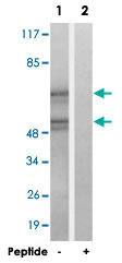 - Western blot analysis of extracts from rat brain cells, using CAMK2B/CAMK2G/CAMK2D polyclonal antibody (Cat # PAB18512).Peptide "+" means "peptide blocking".