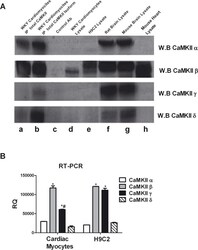 - Fig 1 CaMKII isoforms. A: To evaluate the expression of CaMKII isoforms in ventricular adult cardiomyocytes from WKY rats, the total cell lysates were immunoprecipitated using anti-CaMKII antibody (lane a) or anti-CaMKII alpha, beta gamma or delta specific antibodies (lane b) and together to total samples from WKY cardiomyocytes (lane d) and H9C2 cardiomyoblasts (lane e) were analyzed by western blot with anti-CaMKII alpha, beta gamma or delta antibodies as indicated. Total extracts from rat brain (lane f), mouse brain (lane g) and mouse heart (lane h) were used as controls. Total lysates from WKY cardiomyocytes with specific antibody without A/G agarose beads were used as negative control (lane c). B: Total RNA from H9C2 cell line and isolated ventricular cardiomyocytes was extracted with standard methods. RT-PCR for CaMKII alpha, beta, gamma, and delta was performed as indicated in methods. The representative graph indicates the relative amounts of transcripts for CaMKII isoforms in H9C2s and ventricular adult myocytes from WKY rats. Cycle threshold (Ct) values from 3 independent experiments were normalized to the internal beta-actin control. The ratio of fold change was calculated using the Pfaffl method. * = p