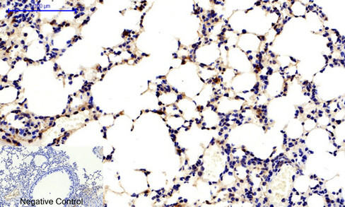- Immunohistochemical analysis of paraffin-embedded Mouse-lung tissue. 1, CaMKII Beta/Gamma/Delta (phospho Thr287) Polyclonal Antibody was diluted at 1:200 (4°C, overnight). 2, Sodium citrate pH 6.0 was used for antibody retrieval (>98°C, 20min). 3, Secondary antibody was diluted at 1:200 (room tempeRature, 30min). Negative control was used by secondary antibody only.