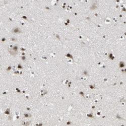 - Immunohistochemical staining of human cerebral cortex shows strong nuclear positivity in neuronal cells and glial cells.