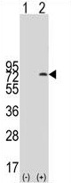- ERM / Etv5 Lysate Cat.-No. AS00100LY-N: Western blot analysis of his-tag ETV5 (arrow) using his tag antibody. 293 cell lysates (2 ug/lane) either nontransfected (Lane 1) or transiently transfected with the ETV5 gene.
