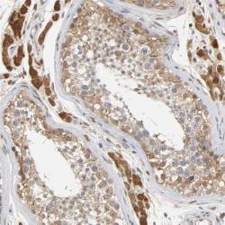 - Immunohistochemical staining of human testis shows distinct cytoplasmic positivity in Leydig cells.
