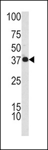- Western blot of CFHL1 antibody in K562 cell line lysates (35 ug/lane). CFHL1 (arrow) was detected using the purified antibody.