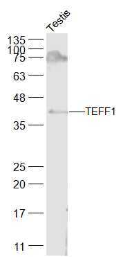 - Mouse testis lysates probed with TEFF1 Polyclonal Antibody, Unconjugated (bs-17320R) at 1:300 dilution and 4°C overnight incubation. Followed by conjugated secondary antibody incubation at 1:20000 for 60 min at 37°C.