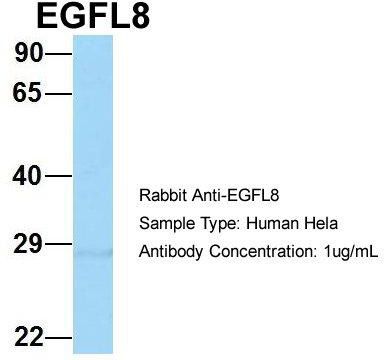 - 4Human Hela; Host: Rabbit; Target Name: EGFL8; Sample Tissue: Hela; Antibody Dilution: 1.0ug/mlEGFL8 is supported by BioGPS gene expression data to be expressed in HeLa