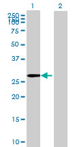 - Western Blot analysis of EGFL8 expression in transfected 293T cell line (H00080864-T01) by EGFL8 MaxPab polyclonal antibody.Lane 1: EGFL8 transfected lysate(32.23 KDa).Lane 2: Non-transfected lysate.