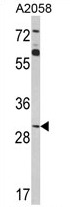 - Western blot analysis of EGFL8 Antibody (Center) (AP17310PU-N) in A2058 cell line lysates (35 µg/lane). EGFL8 (arrow) was detected using the purified Pab.