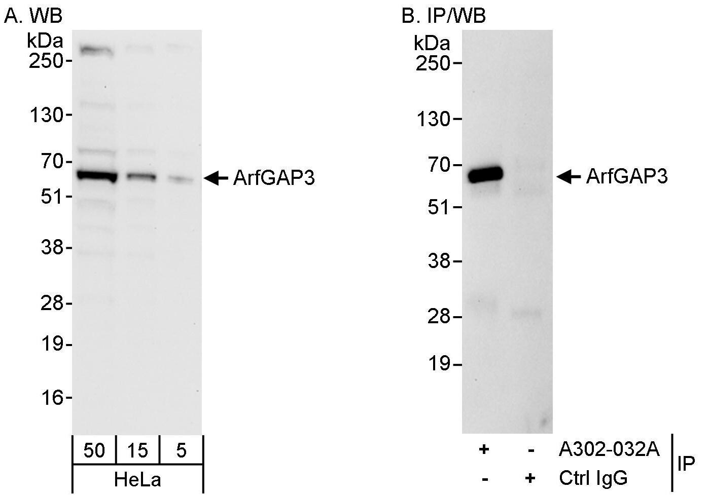 - Detection of human ArfGAP3 by western blot and immunoprecipitation. Samples: Whole cell lysate (5, 15 and 50 µg for WB; 1 mg for IP, 20% of IP loaded) from HeLa cells. Antibody: Affinity purified rabbit anti-ArfGAP3 antibody A302-032A used for WB at 0.04 µg/ml (A) and 1 µg/ml (B) and used for IP at 3 µg/mg lysate. Detection: Chemiluminescence with exposure times of 30 seconds (A) and 10 seconds (B).