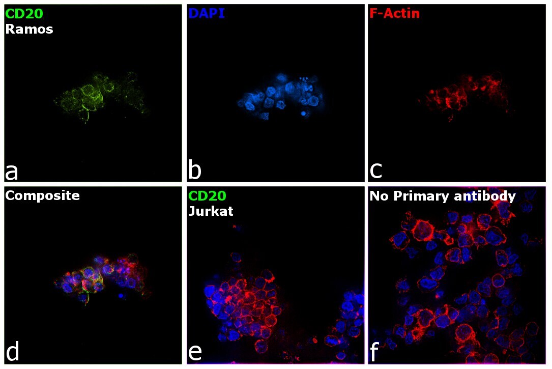 - Immunofluorescence analysis of CD20 was performed using 70% confluent log phase Ramos cells. The cells were fixed with 4% paraformaldehyde for 5 minutes, permeabilized with 0.1% Triton™ X-100 for 10 minutes, and blocked with 2% BSA for 45 minutes at room temperature. The cells were labeled with CD20 Monoclonal Antibody (L26) (Product # MA5-13141) at 1:100 dilution in 0.1% BSA, incubated at 4 degree celsius overnight and then labeled with Donkey anti-Mouse IgG (H+L) Highly Cross-Adsorbed Secondary Antibody, Alexa Fluor Plus 488 (Product # A32766), (1:2000 dilution), for 45 minutes at room temperature (Panel a: Green). Nuclei (Panel b: Blue) were stained with ProLong™ Diamond Antifade Mountant with DAPI (Product # P36962). F-actin (Panel c: Red) was stained with Rhodamine Phalloidin (Product # R415, 1:300). Panel d represents the merged image showing plasma membrane and cytoplasm localization. Panel e represents negative cell line Jurkat. Panel f represents control cells with no primary antibody to assess background. The images were captured at 60X magnification.