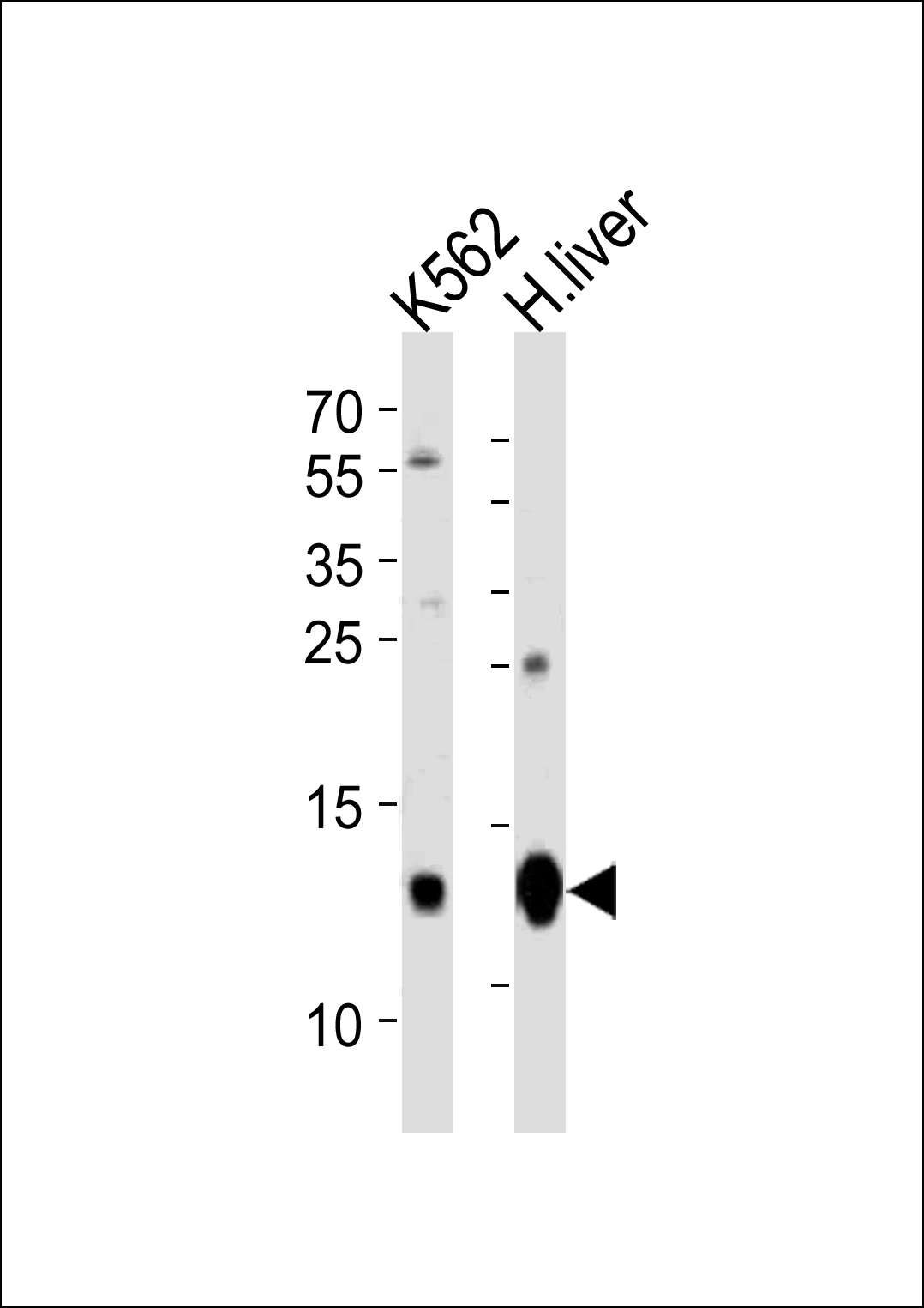 - HBB Antibody (C-term) (Cat.# AP11557b) western blot analysis in K562 cell and human liver tissue lysates (35ug/lane). This demonstrates the HBB antibody detected HBB protein (arrow).