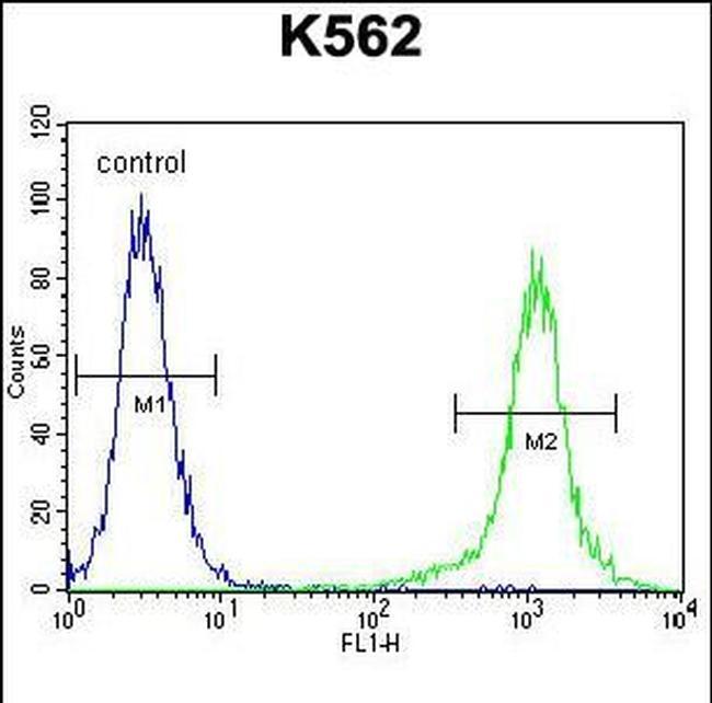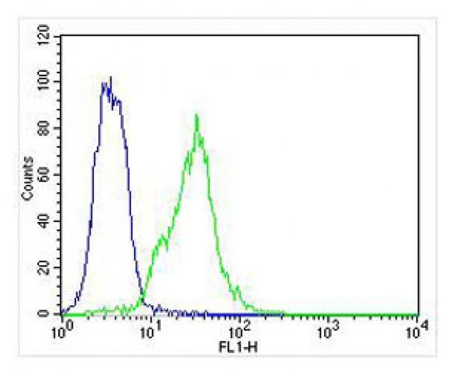 - Flow cytometric analysis of HBB in K562 cells (right histogram) compared to a negative control cell (left histogram). Samples were incubated with a HBB Antibody (C-term) (Product # PA5-48233) followed by incubation with a FITC-conjugated goat-anti-rabbit secondary antibody.