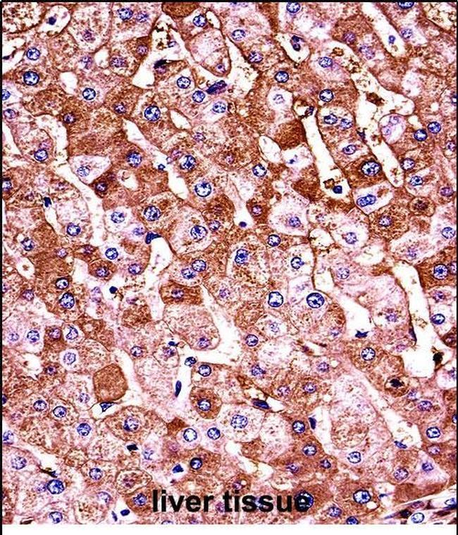 - Immunohistochemical analysis of HBB in formalin fixed and paraffin embedded human liver tissue. Samples were probed with a HBB Antibody (C-term) (Product # PA5-48233) followed by peroxidase conjugation of the secondary antibody and DAB staining.